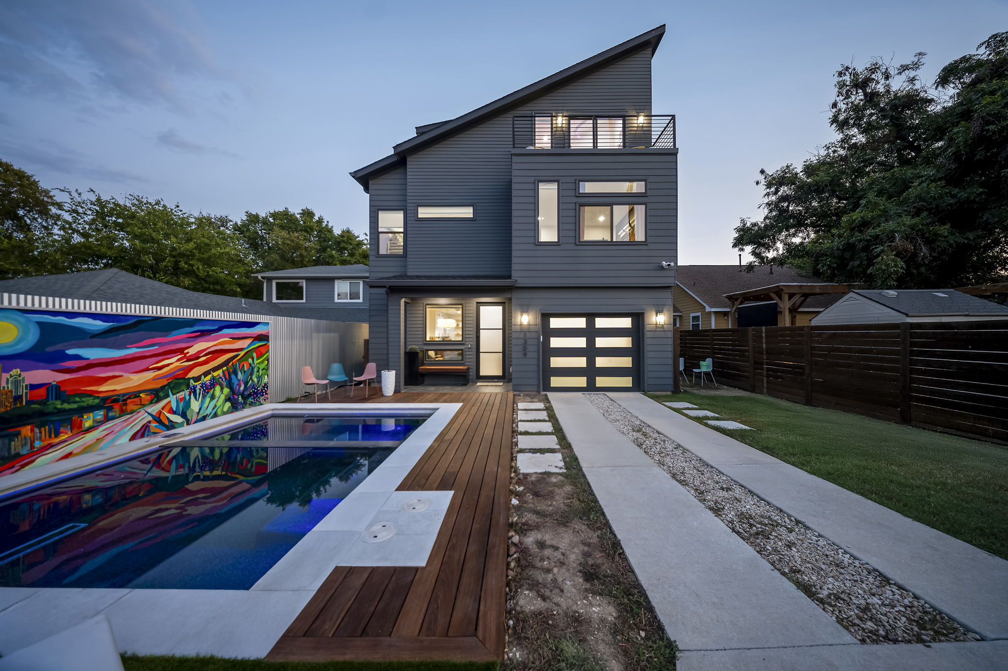 Step into a home that’s more than just a stay – it’s an experience. Out front, the pool pops with a colorful mural backdrop, instantly setting the vibe for sunny afternoons and long, laughter-filled evenings. Inside, the living room and kitchen flow together to keep your group connected, while the first floor adds a jungle-themed queen bedroom and a full bathroom. The garage doubles as a private gym – fully stocked with weights, a mini fridge, and a glowing LED sign that makes even workouts feel like an event.