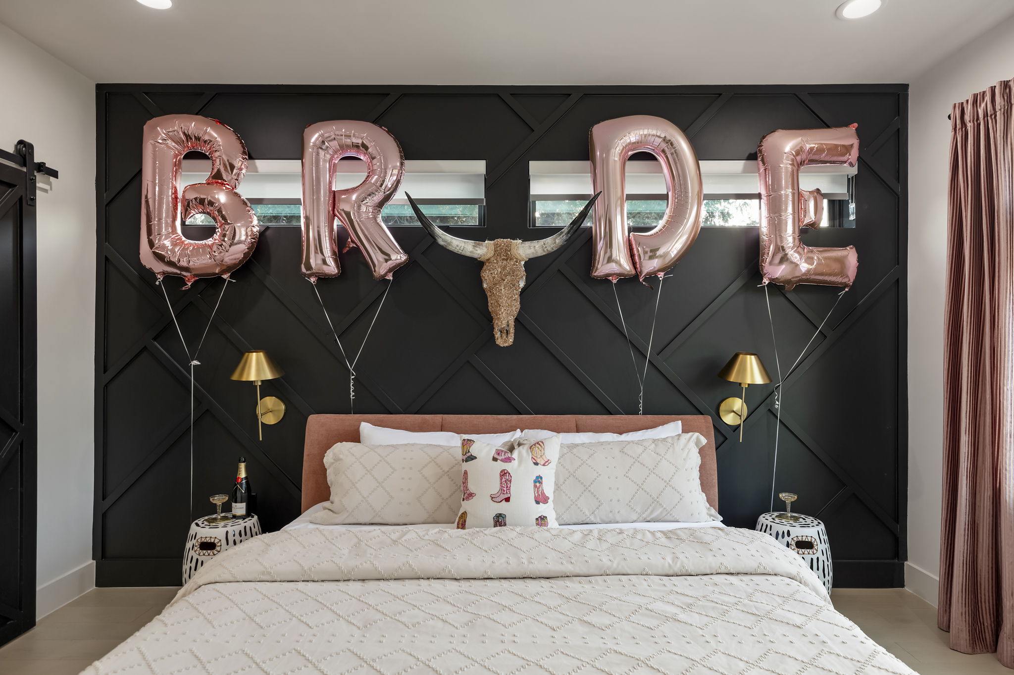 On the top floor, the house shifts into pure play. A queen bedroom glows under a neon sign, while the hidden glam room brings the wow factor – a pink hideout stocked with vanity mirrors, makeup tools, and rows of cowboy hats begging for photo ops. Whether you’re planning a night out or staying in, this space is your go-to for pregame prep, selfies, and unforgettable moments.